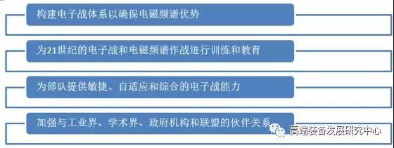 《電子戰(zhàn)戰(zhàn)略》指出,美國電子戰(zhàn)的發(fā)展愿景是通過敏捷、自適應(yīng)和綜合的電子戰(zhàn),在各種軍事行動(dòng)中進(jìn)攻性地奪取電磁頻譜優(yōu)勢,發(fā)展目標(biāo)包括: