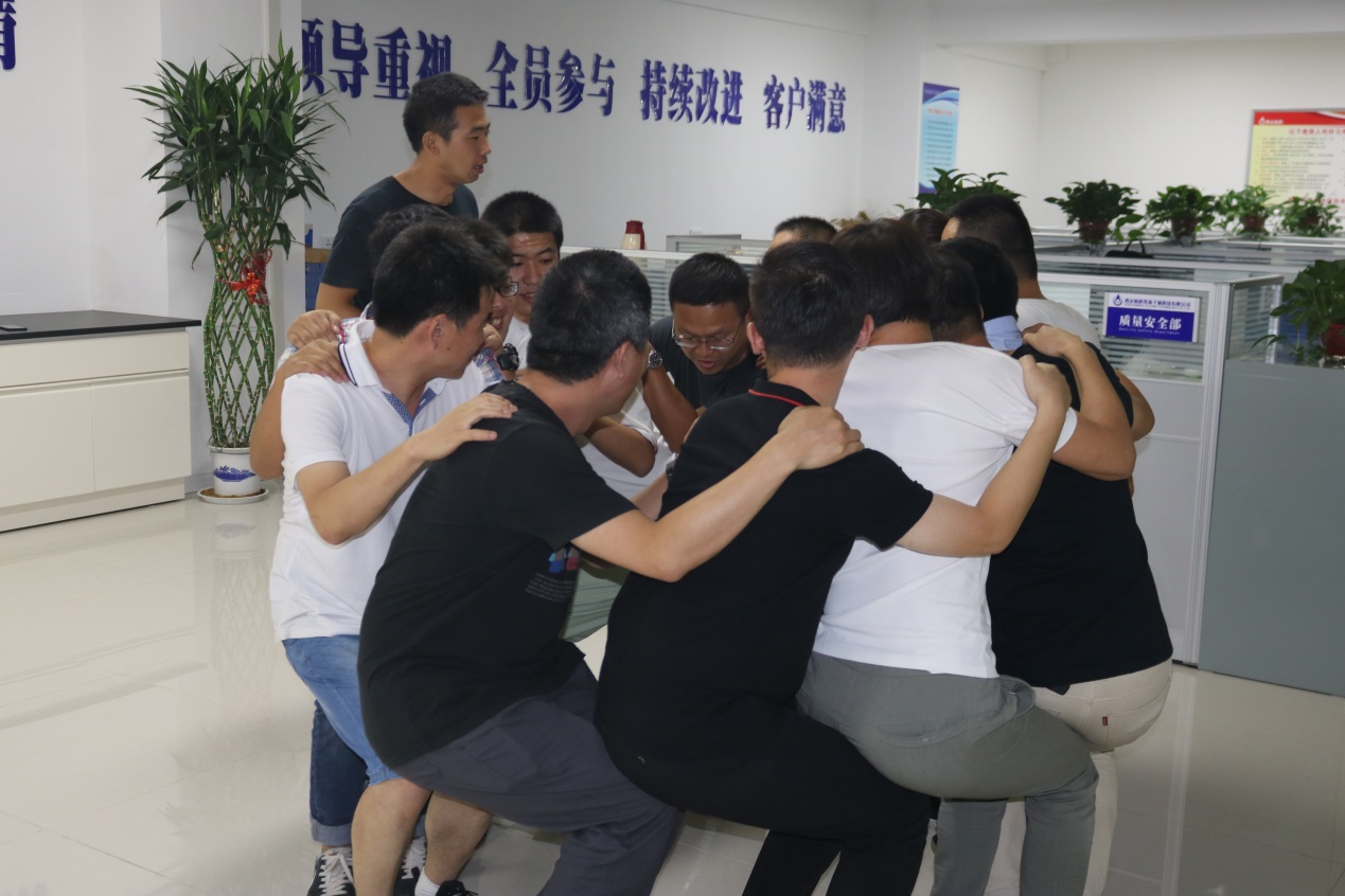 會議結(jié)束后,由綜合管理部郭榮組織全體員工開展了名為“人椅”的團隊建設(shè)活動。分別以奇數(shù)和偶數(shù)組成兩個比賽組,最后看哪個組堅持的時間更長則獲勝,并發(fā)有小禮物作為鼓勵?;顒悠陂g,大家都你爭我搶的談?wù)撟约旱挠^點,也在不斷的嘗試,可慢慢的這種聲音少了,更多的是練習(xí),總結(jié)經(jīng)驗,學(xué)習(xí)別的戰(zhàn)隊的方式,女同志也積極響應(yīng)游戲規(guī)則,在這里,沒有男女,沒有上下級,只有戰(zhàn)友,只有兄弟!