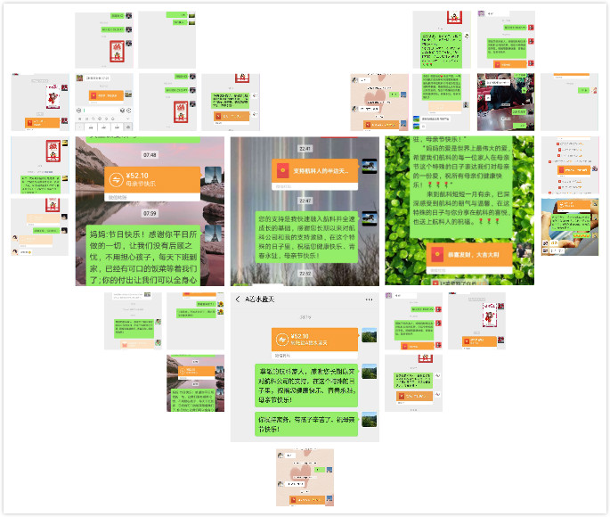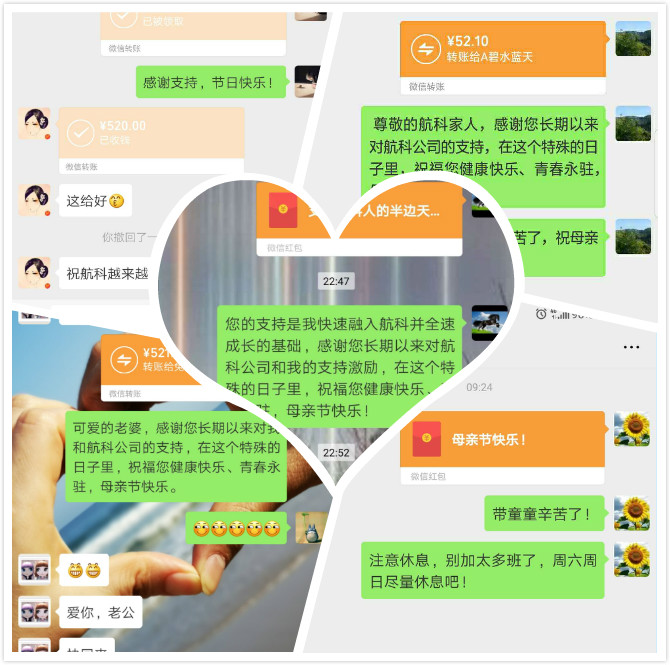 公司員工積極參與,有的在朋友圈發(fā)送給媽媽的感恩之詞并發(fā)送紅包,有的發(fā)送給家庭中的另一半,妻子,讓航科家人共同慶祝母親節(jié)的快樂!